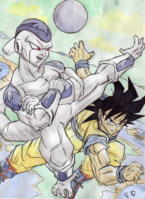 Yup. The title says it all. I just made this one because I suddenly had a hankering to. Pen, and colored with watercolors. I like the dynamics and layout of it though, and i tried to color it somewhat like Toriyama-sensei would.