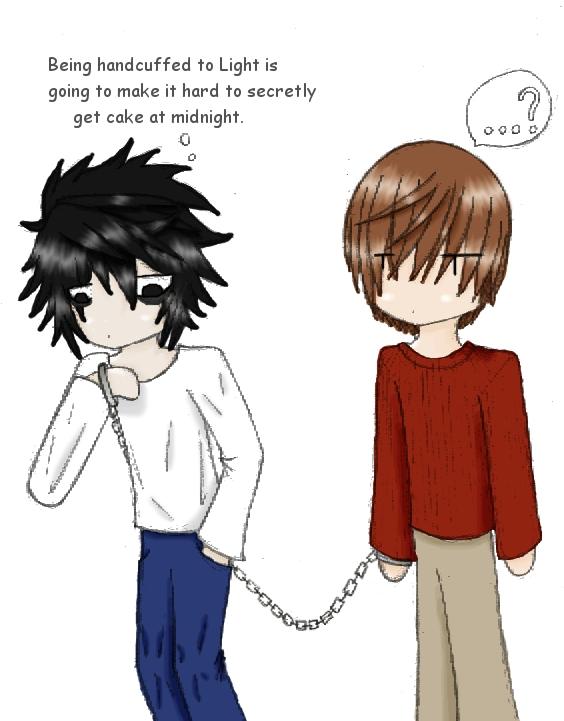 - cake, color, complications, death note, handcuffs, l, light, raito, ryuzaki