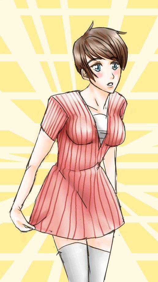 I was trying different colors and the other one was a blue dress and black socks. But I like the pink one better cause its cute ^^ I ike drawing girls with short hair cause it makes them look cute. Sorry if her boobs look big, I dont know how to make them smaller lol