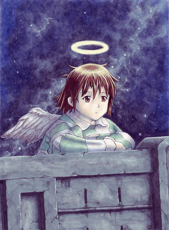 I didn't use "Starry Night" as a direct guide, but thought of it more of an emotional influence on what I was doing with my own work. This was painted primarily with thinned-out acrylic paints, also using some watercolors for the character. The acrylic paints consisted of many layers painted on one after the other. I can control the texture and "depth" better when I work with thinned acrylics put on in gradual layers. Considering the linework, I didn't keep them as clean as I usually do, but decided to make them more scratchy looking. To do that, I used a fine-tip nib for my Deleter pen and went over the lines more than once, deliberately keeping it sketchy. Lastly, I used some cross hatching in the shading, which is very faint. These two techniques I drew inspiration from Yoshitoshi ABe himself, one of my primary influences. (I should note that I took an artistic liberty: you would see a wall behind Rakka, not the sky; but that wouldn't have captured what I wanted. So, I added the star-filled sky.)