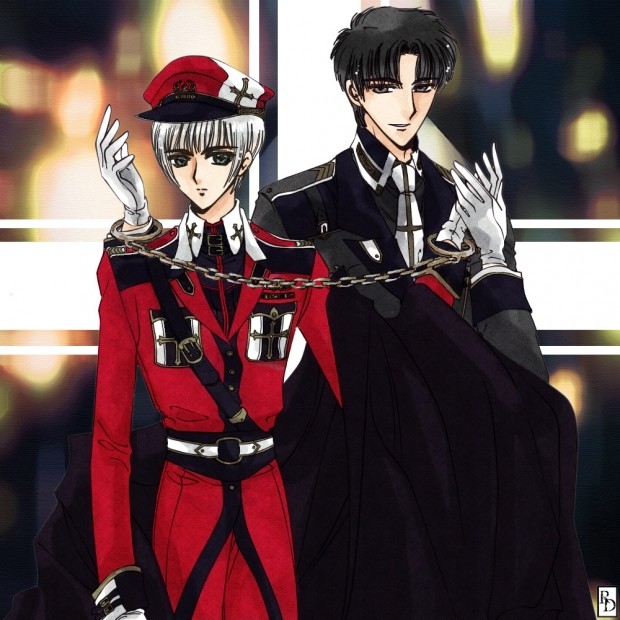 - Black Eyes, Black Hair, Chains, Cloak, Costumes, Cross, Green Eyes, Group, Handcuffs, Hats, Males, Military Uniforms, White Hair