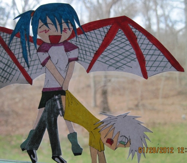 Kirnen is terrified of heights, and part of Caitta's innocence has wings(the gray+red things on her back), so she likes to carry him around for fun because he overreacts so much XD They're really cute together~