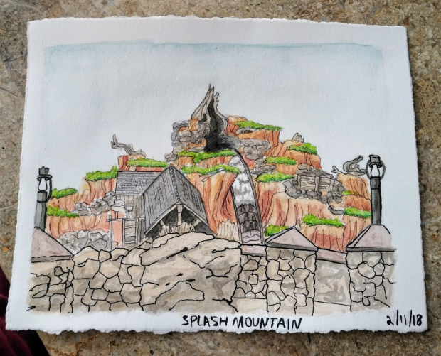 Last week I went to Disney World with my family! While I was there, I watercolored my view of Splash Mountain while my family rode it!