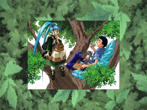 - boy, food, girl, green, lunch, sasami, tenchi, tree