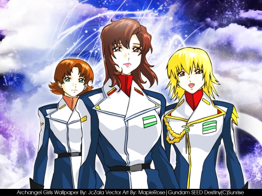 A wallpaper featuring the 3 main female crew of the Archangel Ship. This one was taken from the scene in the 3rd Ending Theme. I just love their pose here. They all look so happy. I came up with an abstract background with a bit of dark colors. The BG is actually a product of my playfulness with the brushes.
