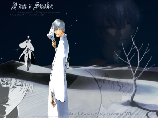 The pair is light and darkness, Gin's two sides. This wallpaper highlights his darker mask, the side that creeps out many of the people around him, the side that he created to walk with Aizen until the right time came along. Therefore, it is night at Las Noches. However, it is not completely bleak. The beautiful night sky image that is the backdrop hints at his true nature which is further indicated in the quote underneath the final part of the "snake" quote.
