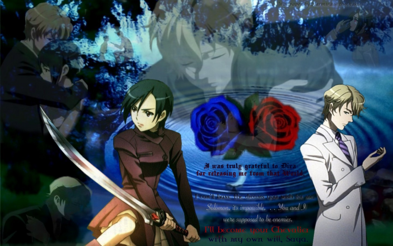 I am really happy with this wallpaper. Not only do I believe that it demonstrates Saya and Solomon's relationship better than my last two tributes to them (I am going to redo or rethink some of my older, favorite wallpapers along with my new ideas). It blends my two styles, back in the day where I created wallpapers by blending snapshots only, and now, still using that but using background images, textures, masking, etc. to take them to the next level.