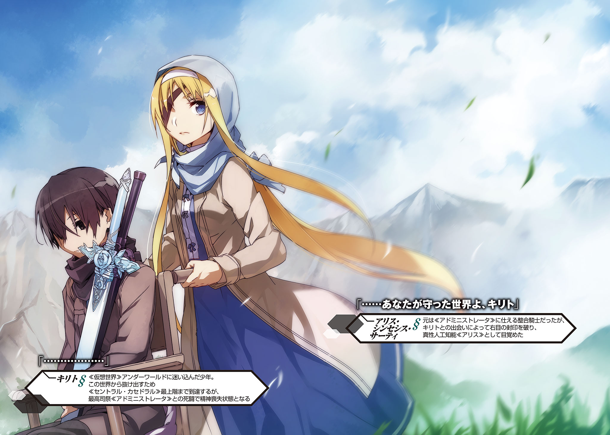 I chose Kirito to use as the star of this wallpaper because the song pretty much fits him perfectly, especially given what's happened to him recently in the anime and light novel versions of SAO. The main image was the hardest part of this wallpaper to make. Not only did I have to splice together two versions of the same illustration to properly remove the original text, I also had to borrow the handle for Kirito's black sword from another image, and repaint the sparks of light coming from Eugeo's broken sword. Once I applied that photoshop filter though, it all became totally seamless.