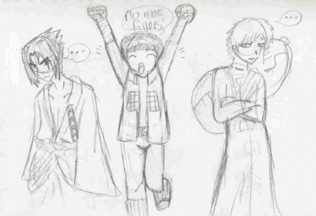 This is a quick sketch of the OT3 (SasuLeeGaa, in case you haven't seen my other works) celebrating the end of the fillers. I am so PUMPED! I watched every single f-ing filler. Some were okay, others...eh. But now it's finally time for the timeskip and I'm all hyped up. I think Gaara's outfit is wrong, but oh well. Like I said before, it's not that great since it's a really quick sketch.