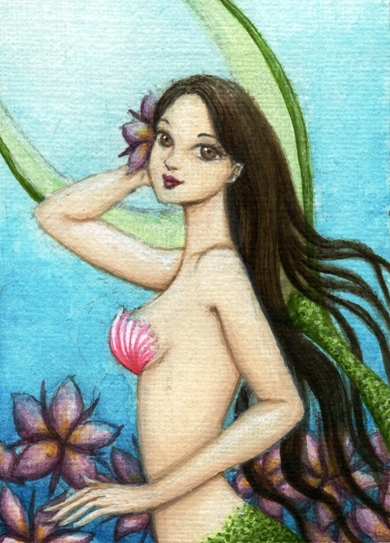 ACEO / miniature acrylic painting. Mermaids are one of my favorite subjects because they are so pretty. "Leila" is part of my 'mermaid girl' collection.