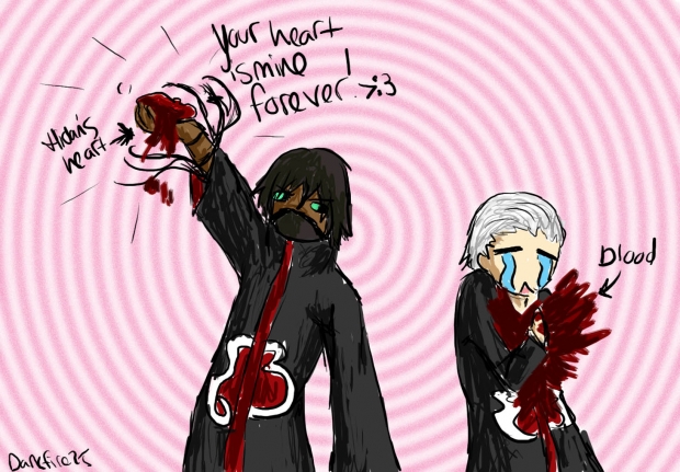 Inspired by the roleplay going on at IMVU. I am Hidan and my friend is Kakuzu :3 We have immense fun roleplaying as these two...and in one of the roleplays Kakuzu had somehow lost 4 of his hearts and needed some more, so he went to Hidan first. Obviously Hidan refused at first, but once he was convinced he actually could live without it, he gave it to Kakuzu...who then said the above title phrase, causing the yaoi fangirls to squeal in glee ^-^ Poor Hidan lost a lot of blood though XD