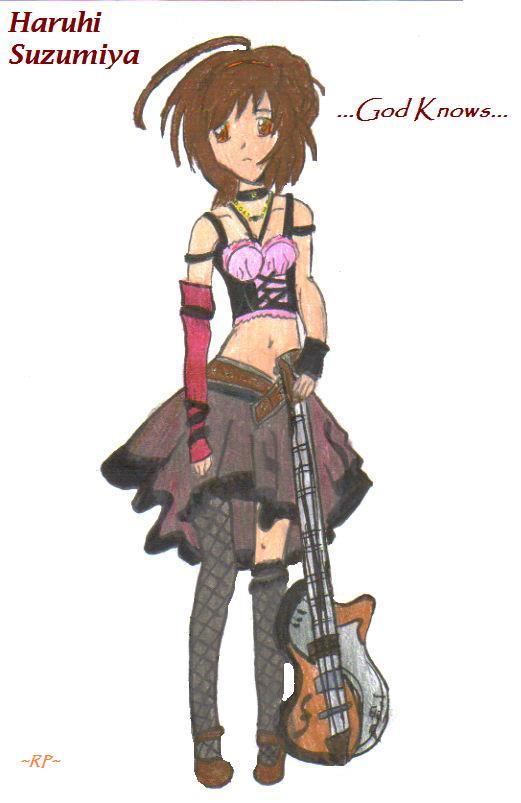 Well... here is Haruhi in her rock star outfit! I think it's really cute... I love the skirt, anyway. Speaking of, it was probably one of the most difficult parts to draw. The next hardest was the guitar. Everything else was fine, although I must admit I did draw a rough draft before this one. The first time I drew her in the middle, and you wouldn't have been able to see her feet or the rest of the guitar. But I wanted to include that, because it was in the reference I used. So... I wanted to see what you all thought of it. Well, opinions are welcome! ![]()
