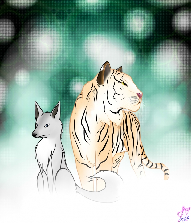 A request from Omnia1: Her Spirit Guides Agadineth Docoroughbou the wolf and Aunker the tigress. I hope I got the details acccurate from the description. I added mist to give the image a more mystical feel. Overall, this was fun, and it's my first time drawing a tiger, so I'm quite proud of it.