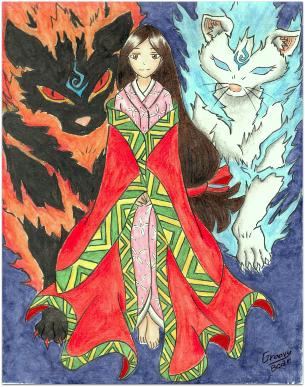 So the black cat on the left is Kaen, one of the "bad guys", on the right there's Shirayuki and in the middle there's princess Kirihime. I won't tell anything else about it though..!