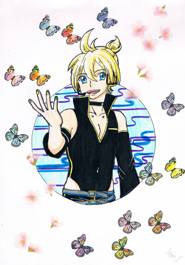 - butterfly, flower, kagamine len, male, sakura, vocaloid