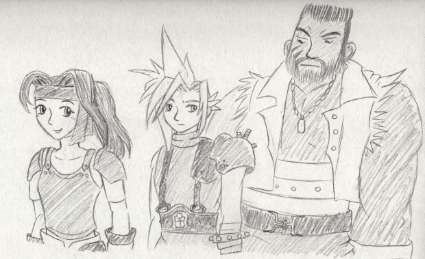 I did this quick sketchy of Jessie, Cloud, and Barret a few days ago because my sister's been playing Final Fantasy 7. (Avalanche is what their secret group is called.)