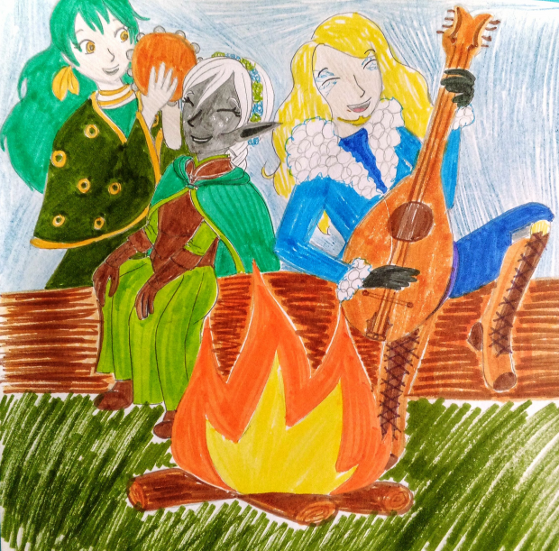 - ArtFight, ArtFight 2023, bard, campfire, D&D, DND, drow, elf, GreebGreeb, human, OC, Preshie, Veiledbyamask