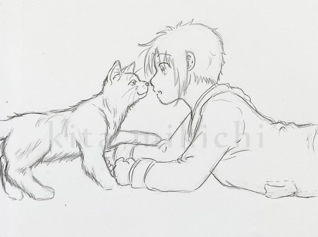 A semi-recent sketch: Naoyuki was playing with a kitty and surprised to be booped. ^-^