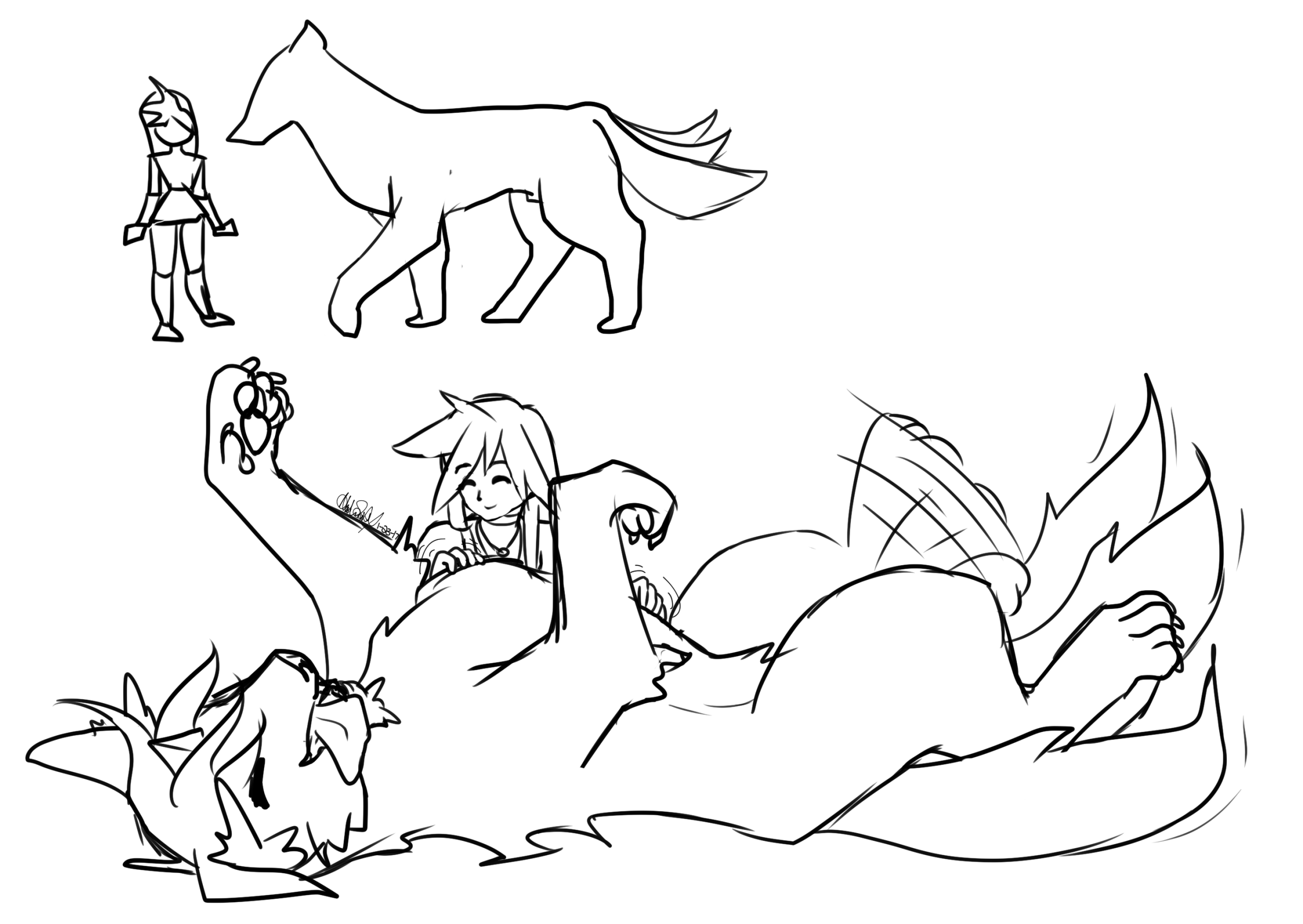 This is Yuna and her pet, Kyo, bonding with belly scratches :) btw the little doodle in the corner was my way of remembering the size difference and try to proportion it correctly in the sketch (I can't tell if I succeeded or not T^T)