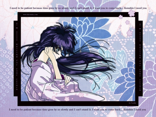 Another wall from Rurouni Kenshin, yes I know I�ve done many walls of it but in my opinion RK is one of the most wonderful series I�ve ever seen ^-^ The making: The picture of Kaoru is actually a screenshot from the ending �Tactics� by The Yellow Monkey. I vectored it (this is the first time I do a vector and it was a really challenge for me because I�ve never used Illustrator before so it was quite complicated to do it specially the hair, that�s why I changed it a little bit . I�ve read lots of tutorials to know how to use the pen tool and I�ve practise pretty much! It took me two weeks to finish the vector. By the way, thank you very much sweetdevil for your good advice ^^ The background is pretty simple because I wanted to focus on the character. I took the flower�s texture from the RK Artbook Master Piece Collection (www.the-oro.com) I've uploaded the wall again like the others as well because when I have submmited the colors of my wall had changed (don't know the reason)