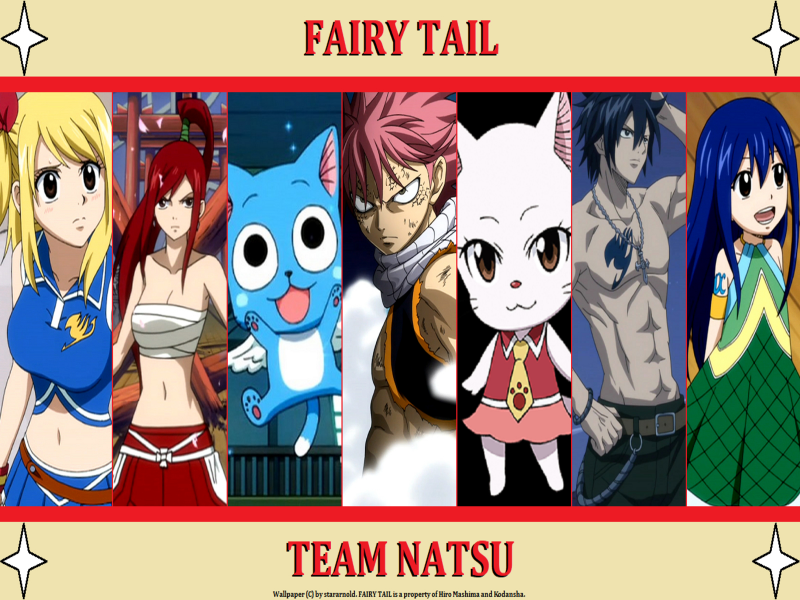 A wallpaper featuring Team Natsu of the Fairy Tail Guild from the anime T.V. series Fairy Tail.