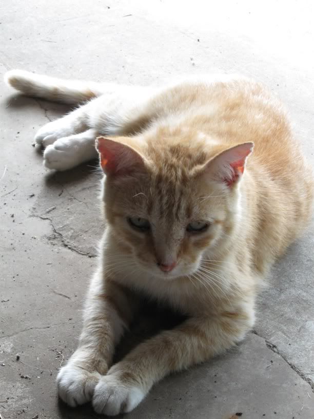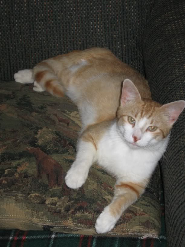 George, one of the orange triplets; he swapped out with his brother about three weeks ago, and we expect Lucky to return sometime or other. George is a little skittish, but he's a sweetheart, and once he gets over the instant "it's gonna kill me" reaction, he'll practically melt onto your leg. Very pleasant miaow.