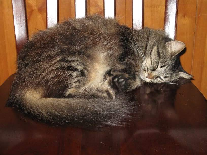 Buster, also known as the Old Man. We got him less than six months after we moved here, which would be about late '98, and he was about three then. Probably the politest cat ever—he'll pat your leg and look inquiringly at you when he wants your lap, and his miaow is nonexistent unless he's trapped on the wrong side of a door—and yet he ruled the neighborhood with an iron paw. He'd come home some nights with a torn ear or something superficial, and I'd go out biking and find some other cat looking like it just came out of the M*A*S*H ward.