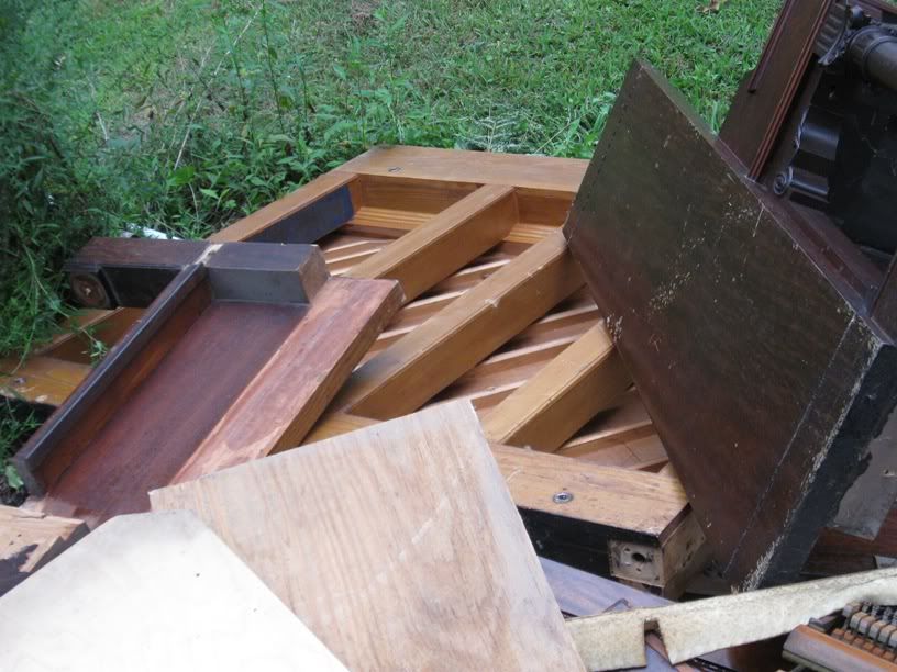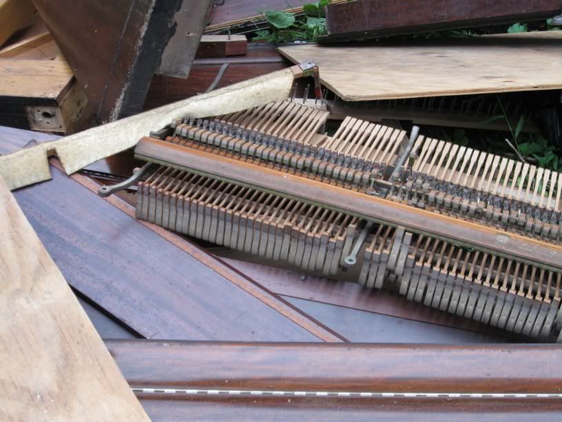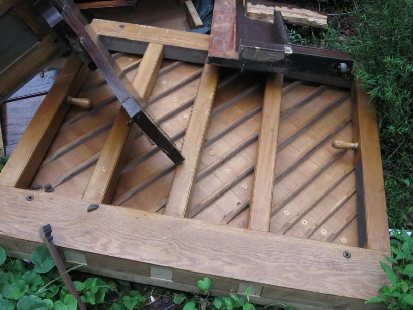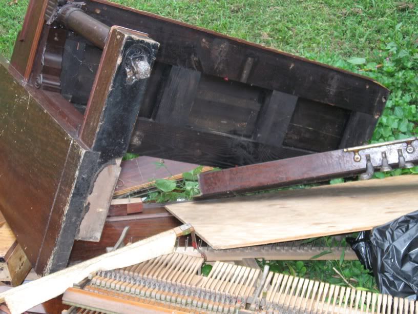 If you have never rolled a hundred-year-old upright piano down your driveway, you just haven't lived. The poor thing made a different cracking noise every time we dropped it down again, and eventually the plate, pictured here but upside down (sorry), fell out of the rest of the wood frame, so we shoved the frame to one side and lugged the monstrosity—which probably weighs close to two hundred pounds—the rest of the way, and then proceeded to kick the frame repeatedly until it became sufficiently damaged . . . or at least until we were tired of kicking it.